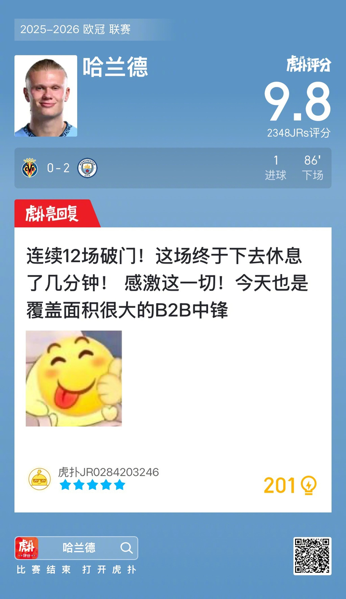 欧冠战场上,曼城客场2-0击败比利亚雷亚尔,哈兰德打进一球并赛后收获虎扑9.8的高分。别只看比分,比赛里有好戏也有槽点,英超霸主的气质和欧战细节被放大检验。